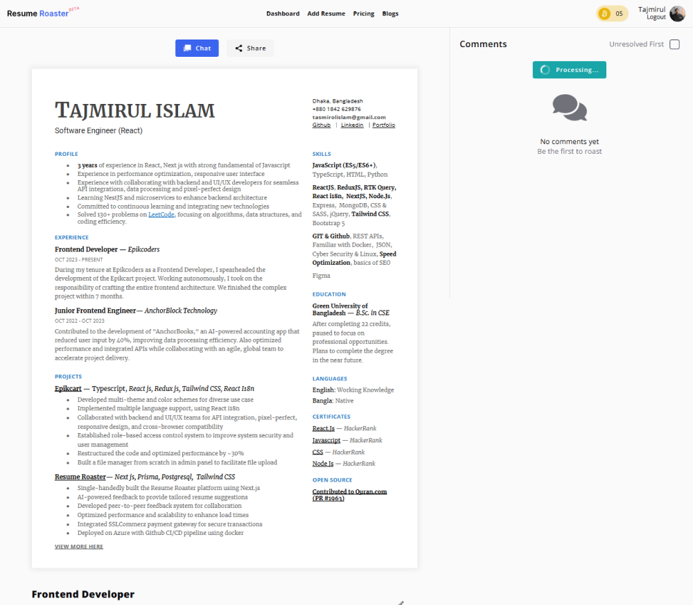 Resume Roaster is a web application designed to provide tailored resume feedback and professional writing services. Built with Next.js, PostgreSQL, Prisma, and Tailwind CSS, it integrates GPT-4 for AI-powered recommendations. The platform also includes peer-to-peer reviews with a points-based system, fostering a collaborative and engaging experience. Targeting freshers, experienced professionals, and programmers, it helps optimize resumes for job-specific success.